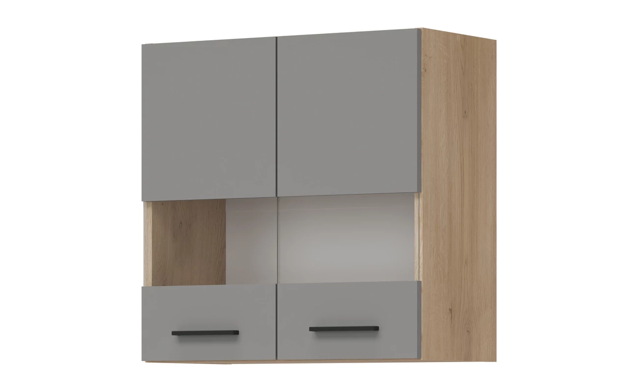 PATI Felső vitrines szekrény 60cm 2 ajtóval Világos grafit Fronttal és Cremona Torro tölgy korpusszal, fekete fogantyúval